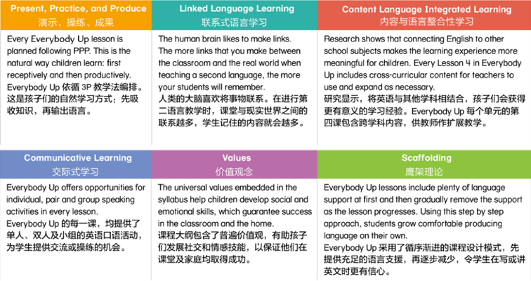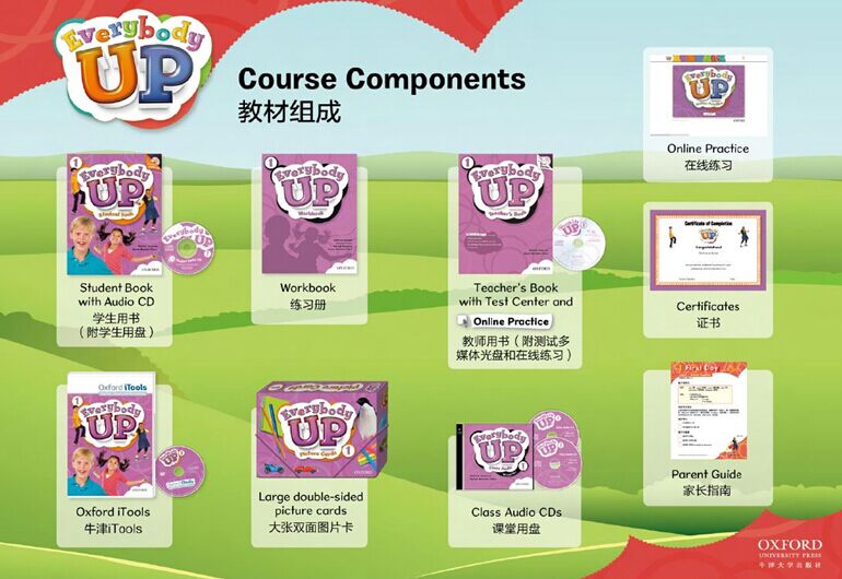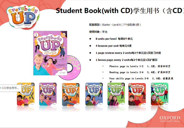 《Everybody Up》 是为小学生准备的一个有七级目标的课程。本书特色是为孩子们提供了一个清晰稳定的语言学习过程, 孩子们会在日常生活中使用这些词汇、短语或句型。学生课本中有丰富多彩的图片与简单易懂的注释, 这些都会在很大程度上帮助学生把课内知识与日常生活结合起来。